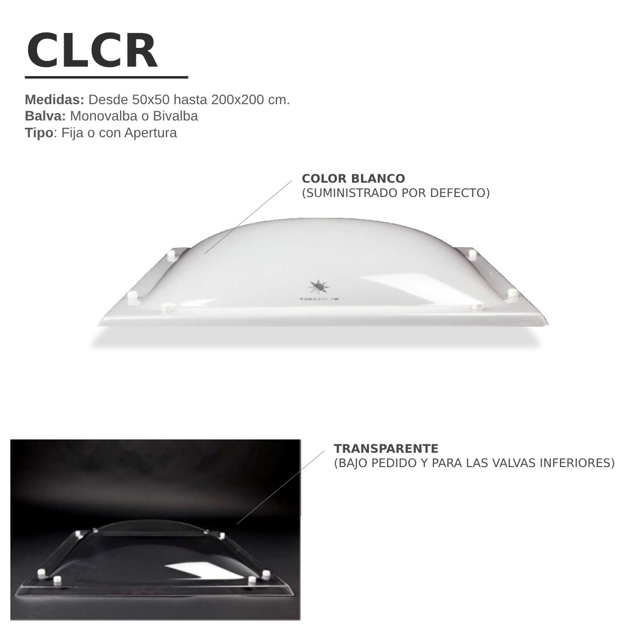 IMPORTANTE: Por favor, tenga en cuenta que si desea el color de la cúpula transparente, este solo está disponible para valvas inferiores y bajo pedido.