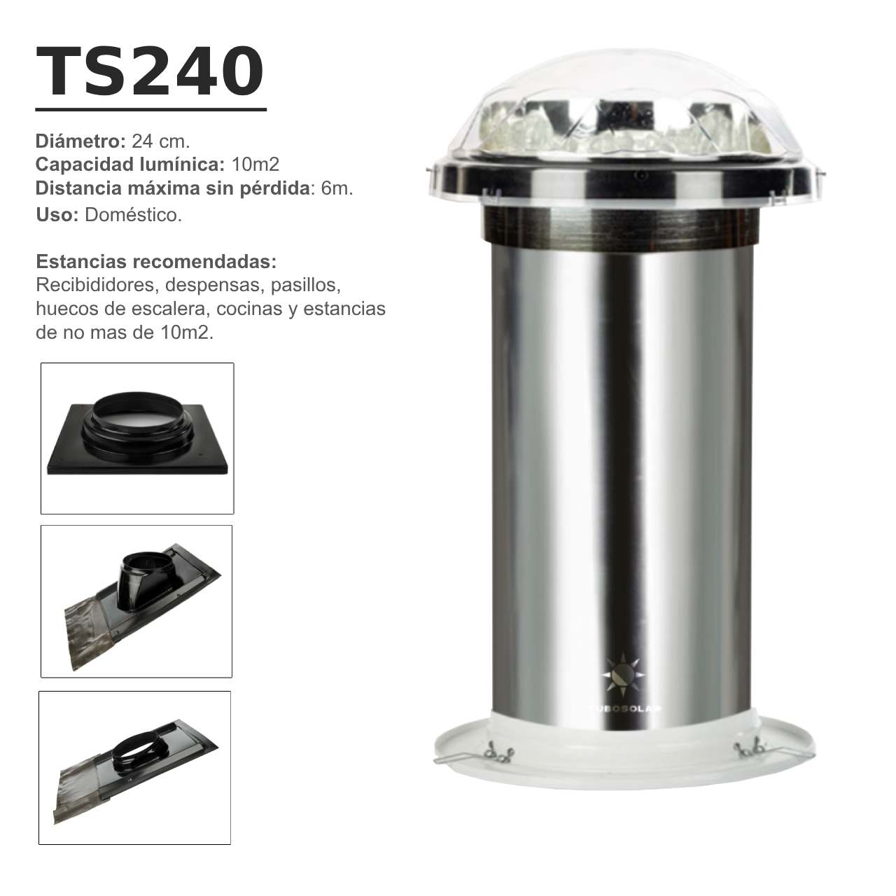 Los tubos solares TS240 son ideales para iluminar espacios de hasta 10 m2. Este diámetro de tubo está indicado para distancias desde tejado a interior de vivienda máximas de 6 metros. Si la distancia que tiene es superior elija el modelo TS340 que con 34 cm de diámetro de tubo permite una distancia mayor de hasta 8 metros de distancia.
